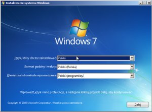 Instalujemy system Windows 7Do napędu DVD wkładamy płytę z systemem i restartujemy komputera. Maszyna powinna uruchomić się z płyty DVD. Jeśli tak się nie dzieje należy wskazać w BIOS komputera z jakiego napędu ma on wystartować [Zobacz].
